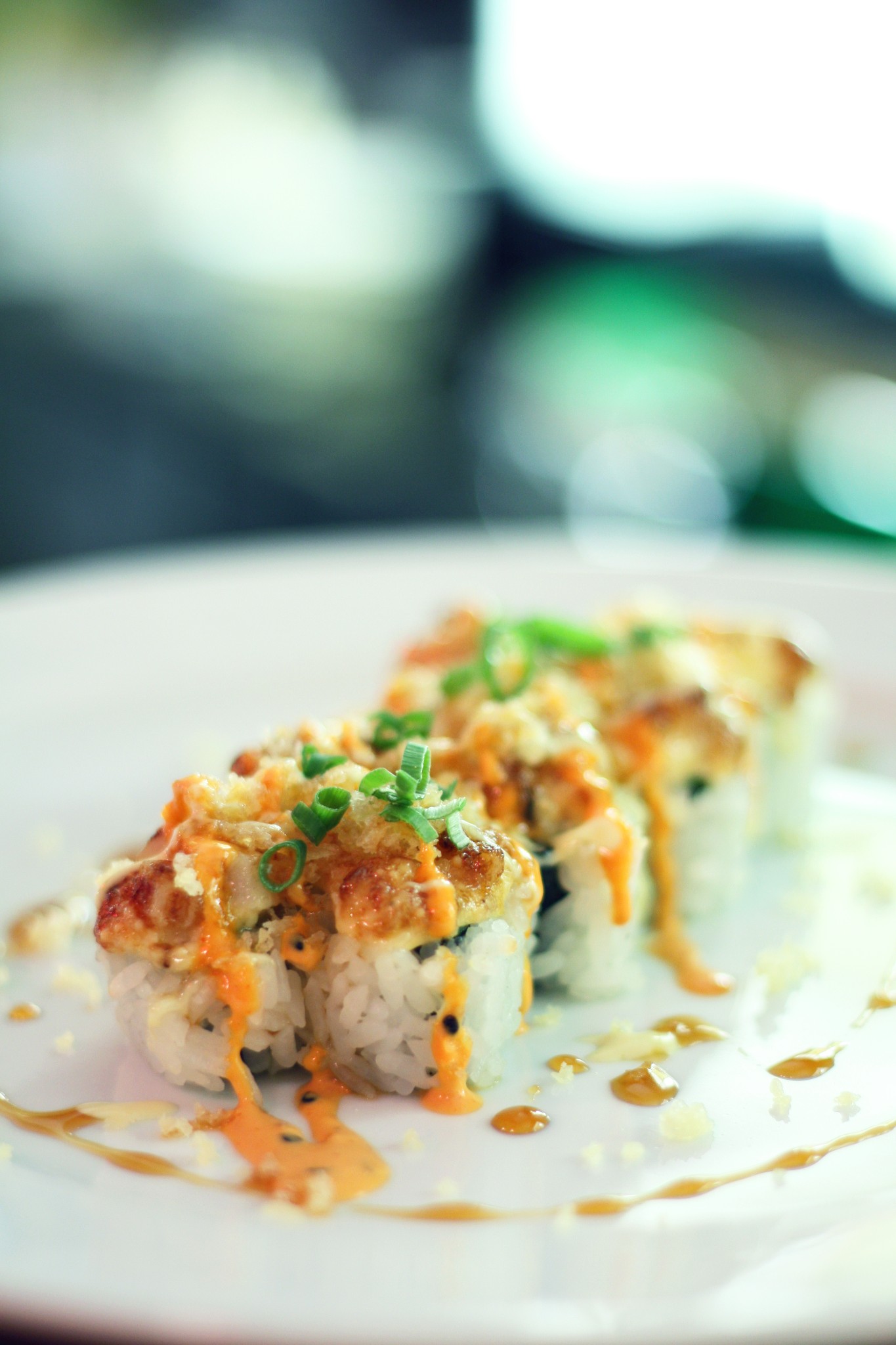 Deep fried Eel, Salmon, Avocado and cream cheese roll glazed with eel sauce and special mayonaise