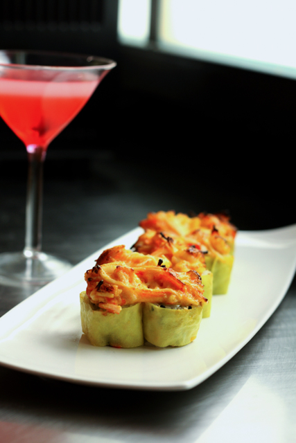 Crab and avocado roll wrapped in soy paper toped with spicy shrimp and crab, BAKED